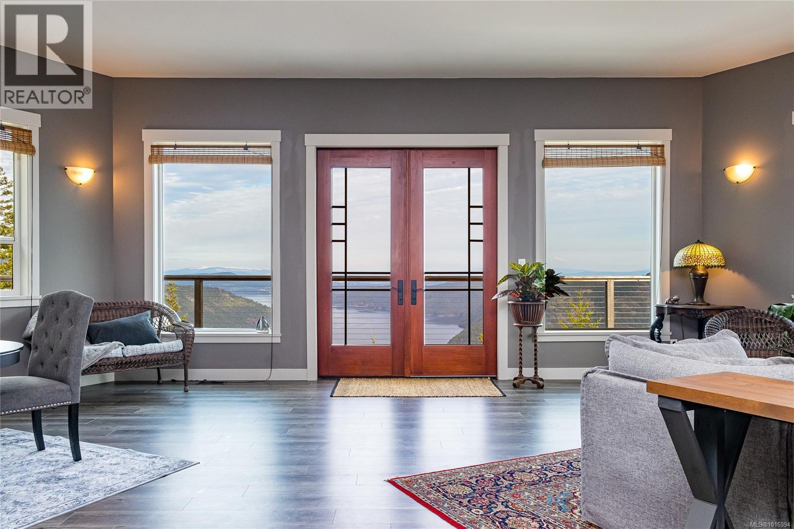 Perched on a mountainside in Goldstream Heights, this breathtaking 5.9 acre estate offers exceptional privacy and panoramic views of Finlayson Arm, Mt. Baker, the Gulf & San Juan Islands, downtown Victoria, and the Peninsula. The property features a modern 3-bed, 2-bath rancher (2,030 sq. ft.) and a detached 1-bed, 1-bath carriage house (1,025 sq. ft.) with a 1,225 sq. ft. triple garage/shop. Both dwellings are mobility-friendly, offering single-level living and ground-level access. Designed to capture the views from nearly every room, the home showcases 10’ ceilings, oversized windows, an open-concept layout, a gourmet kitchen with propane range, and a spa-inspired ensuite. Enjoy outdoor living on the 600 sq. ft. wraparound deck. Additional features include a fully ducted heat pump, state-of-the-art fire suppression system, and low-maintenance landscaping. Located on a quiet cul-de-sac with direct access to horse and hiking trails, the Sooke Hills Wilderness Trail, and Wrigglesworth Lake, all just 20 minutes to Langford or Mill Bay. (id:35114)